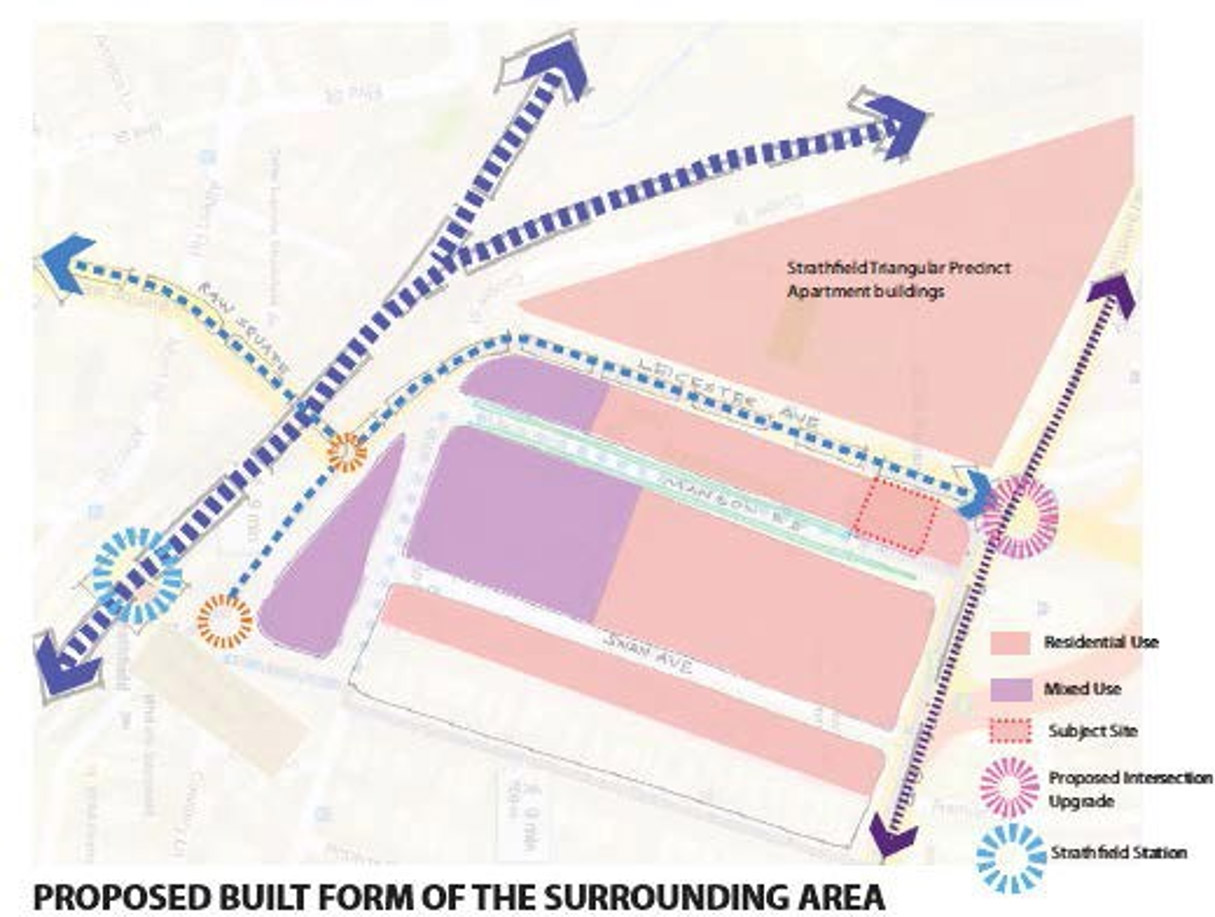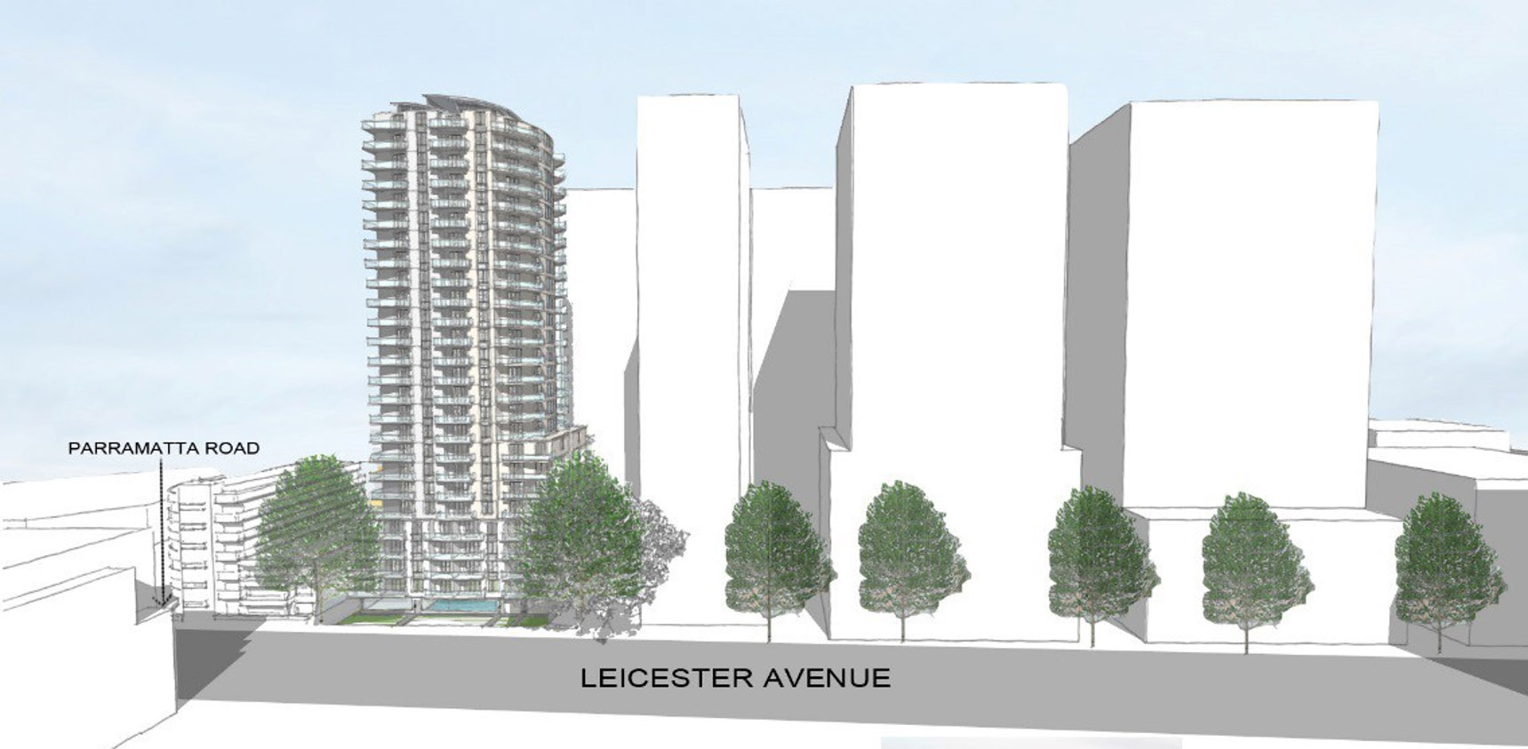Planning proposal for future development in the heart of Strathfield, situated about 500m from Strathfield station. The proposal is a 82 meter high rise shop-top residential flat building in the intersection of Parramatta Road and Leicester Avenue, providing approximately 26 storey, 140 residential units and 5 basement car parking.